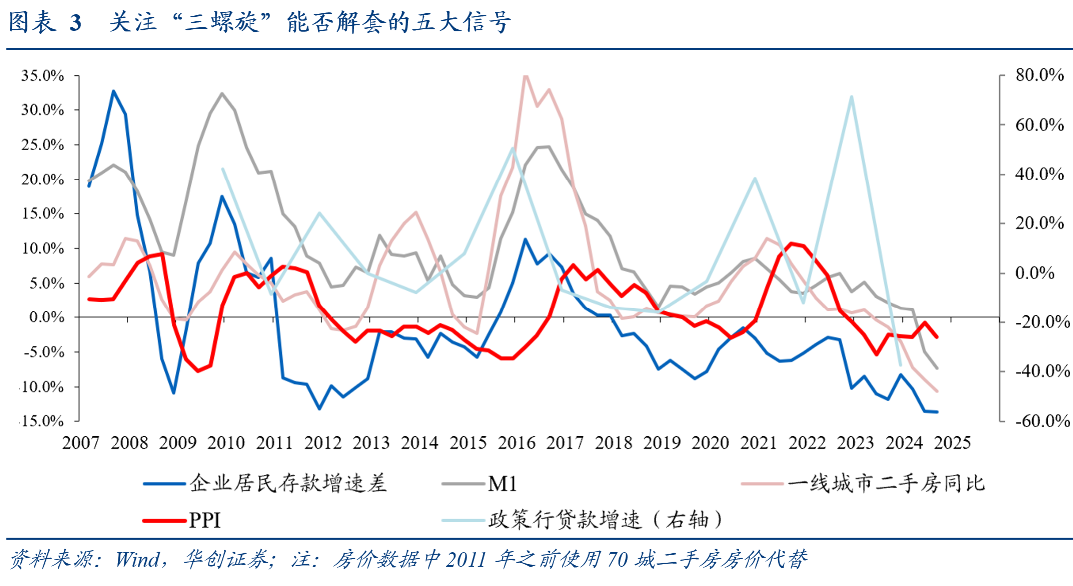 理解:我们总结当下经济问题的核心矛盾是以股价、房价、PPI为代表的预期、财富和经济三大领域的螺旋交织偏弱(具体逻辑可参考年报《【华创宏观】解开三螺旋——宏观2025年年度策略报告》)。从工作抓手和见效快慢的排序而言,预期和财富应领先于经济。资本市场作为预期中的“预期”,定价最为领先和灵活,股市稳住是所有预期稳住的第一步。房市作为中国居民部门最大的存量资产,房市稳住了,居民存量资产负债表才可稳定,存量变化是流量变化的基础,是激活内需的第一步。因此稳住股市楼市是稳定整体经济和预期的抓手。