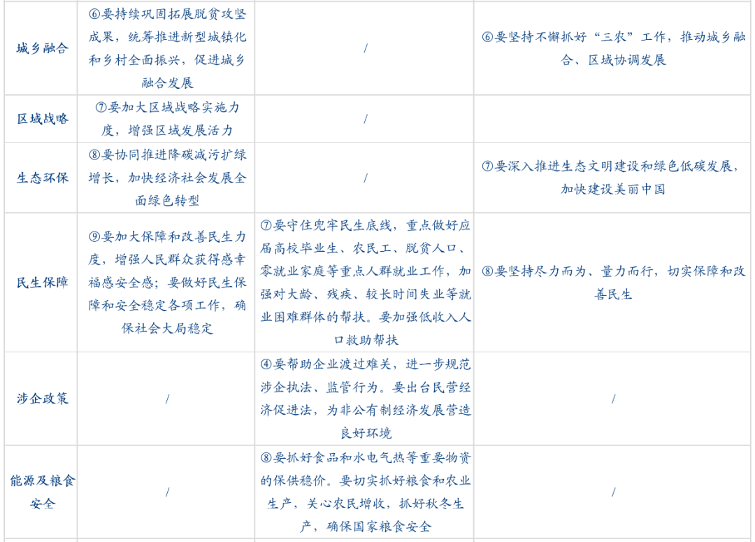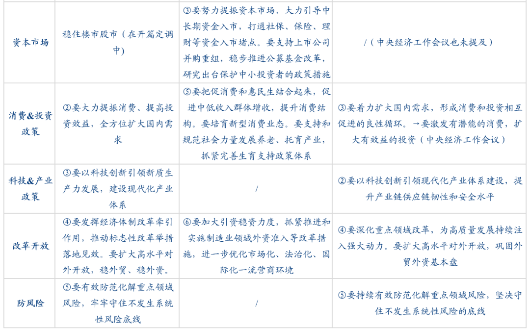 通稿比对:正文第三段往往是部署的总纲型段落,2023年12月的排序是:财政货币、科技产业、扩内需、高质量、扩大开放、化解风险、三农及城乡融合、生态文明、民生保障(尽力而为、量力而行)。2024年12月的排序是:财政货币、扩内需、科技产业、改革、扩大开放、化解风险、城乡融合、绿色转型、民生保障(加大保障和改善力度)。