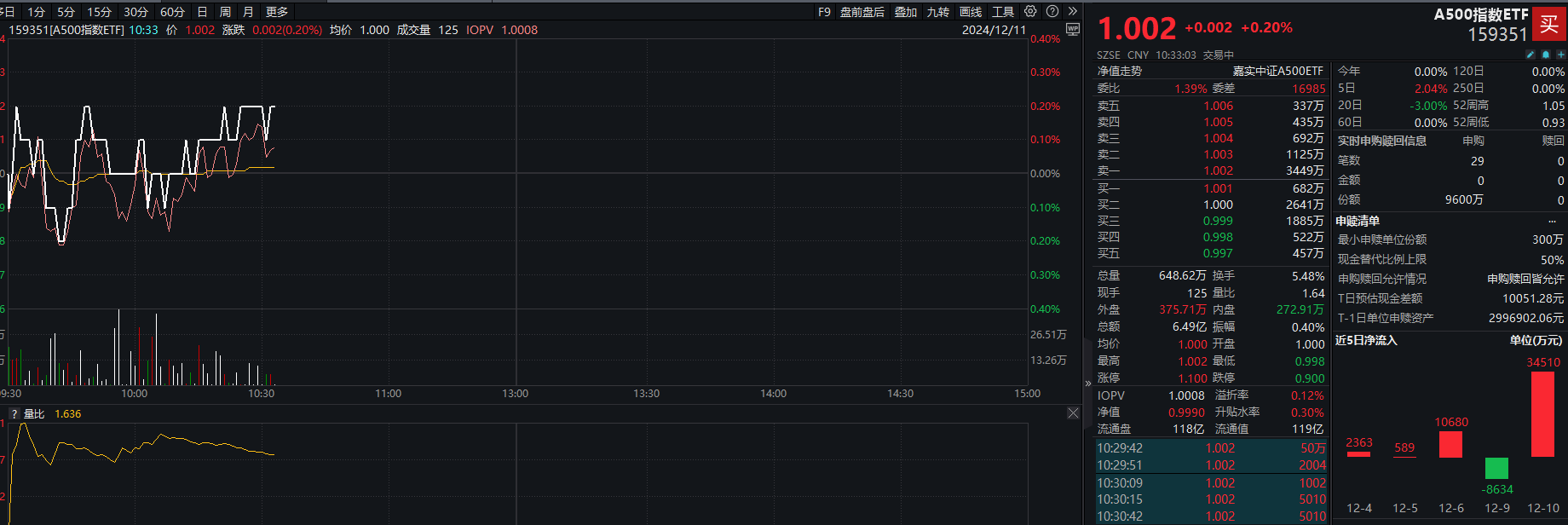 相关ETF方面,A500指数ETF(159351)现涨0.20%,交投活跃。具体来看,该ETF成交额达6.49亿元,换手率为5.48%。 相关成分股方面,移远通信涨停,建元信托、利亚德、金螳螂等跟涨。