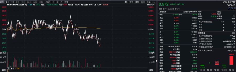 相关ETF方面,A500指数ETF(560610)截至发稿跌0.21%,成交额10.75亿元,换手率7.20%,盘中交投活跃,溢折率0.12%,盘中频现溢价交易。
