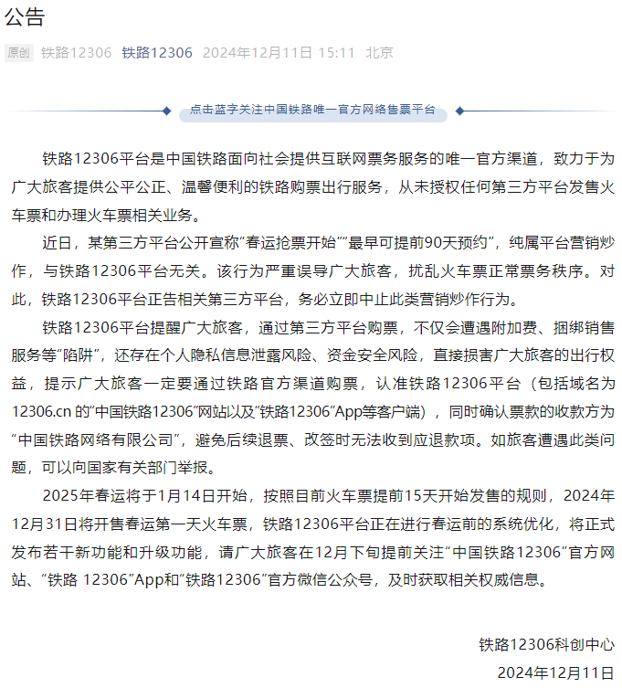 公告中还提到,铁路12306平台是中国铁路面向社会提供互联网票务服务的唯一官方渠道,致力于为广大旅客提供公平公正、温馨便利的铁路购票出行服务,从未授权任何第三方平台发售火车票和办理火车票相关业务。