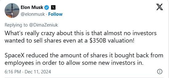 马斯克在社交媒体上回复有关SpaceX股票出售的帖子时写道,在3500亿美元的新估值下,几乎没有投资者愿意出售股票。“SpaceX减少了从员工手中回购的股票数量,以允许一些新投资者进入。”