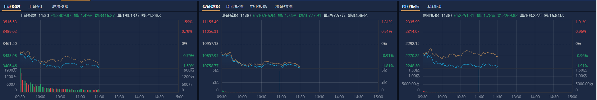 市场早盘震荡调整,三大指数均跌超1%。截至早盘收盘,沪指跌1.49%,深成指跌1.74%,创业板指跌1.78%。盘面上个股跌多涨少,全市场超4000股下跌,但仍有近百股涨停或涨超10%。