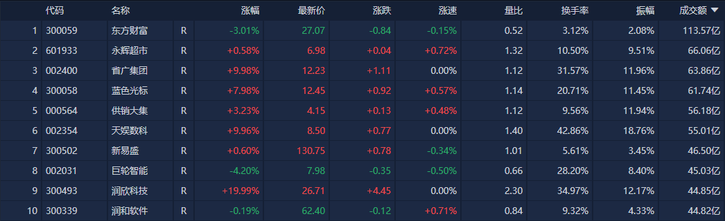 资金面上,沪深两市半日成交额1.22万亿,较上个交易日放量547亿。个股方面,南财金融终端显示,东方财富成交额113.57亿元居首,永辉超市、省广集团、蓝色光标成交额靠前。