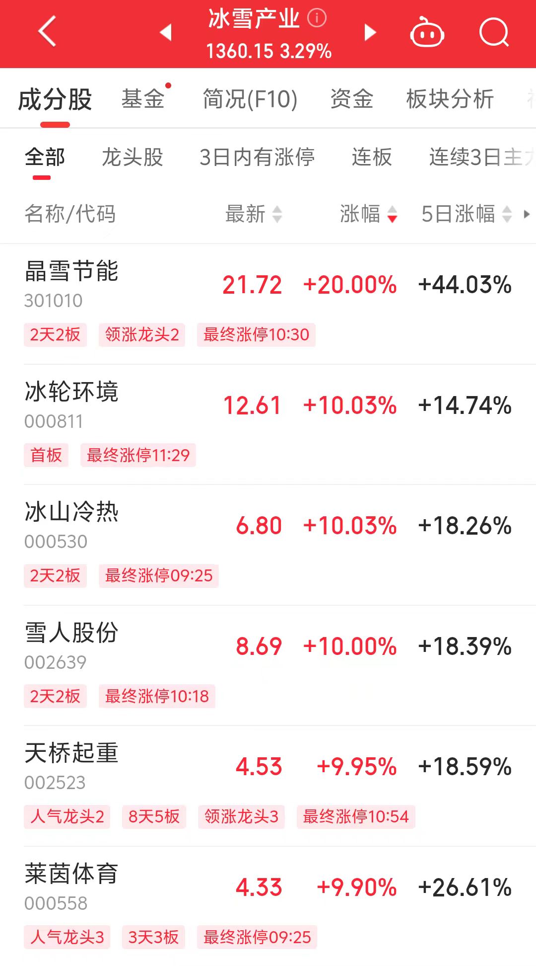 12月13日,同花顺冰雪产业概念指数连续三日上涨,截至早盘收盘,该指数涨3.29%,成分股中,晶雪节能(301010.SZ)、冰山冷热(000530.SZ)、雪人股份(002639.SZ)、莱茵体育(000558.SZ)涨停。
