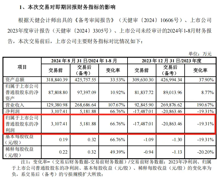 大叶股份发布交易报告书(草案)显示,大叶股份并购目标公司100%股权前后的归母净利润,2023年分别为-1.75亿元、-2.09亿元,2024年前8月分别为3107.41万元、5181.88万元。
