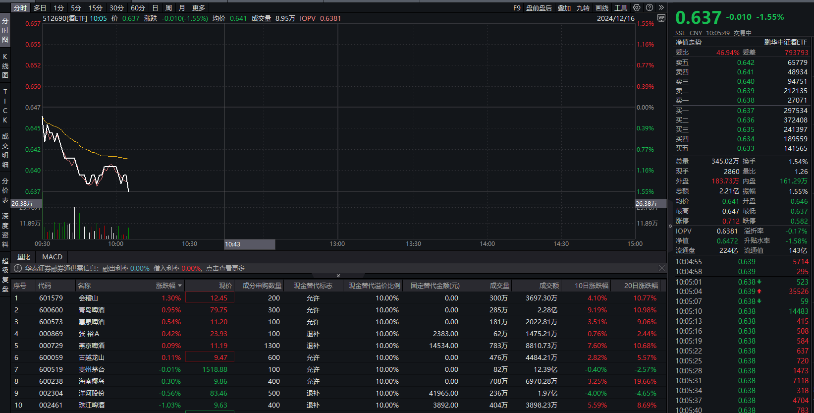相关ETF中,截至发稿,酒ETF(512690)跌1.55%,成分股中,会稽山涨1.30%,青岛啤酒、惠泉啤酒等多股跟涨。