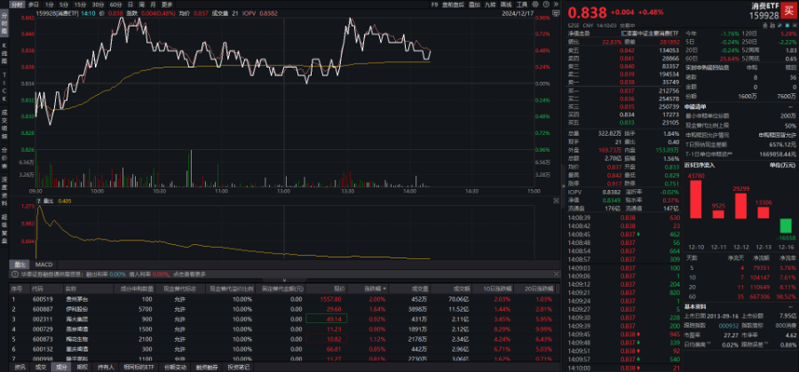 相关ETF方面,消费ETF(159928)盘中翻红,截至发稿上涨0.48%,成交额达2.7亿元,换手率1.84%。