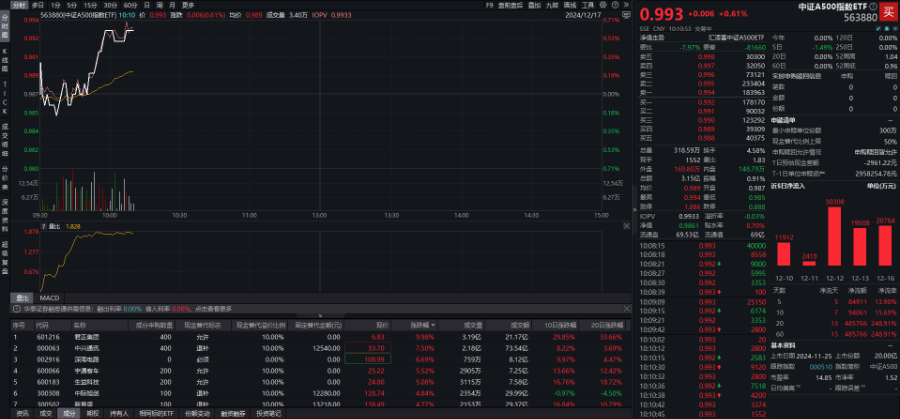 12月17日,A股市场分化,创业板指涨超1%,截至发稿,中证A500指数涨0.82%,成分股中,君正集团涨停,中兴通讯涨8.93%,深南电路涨7.44%,宇通客车、生益科技涨超5%,中际旭创、新易盛等跟涨。