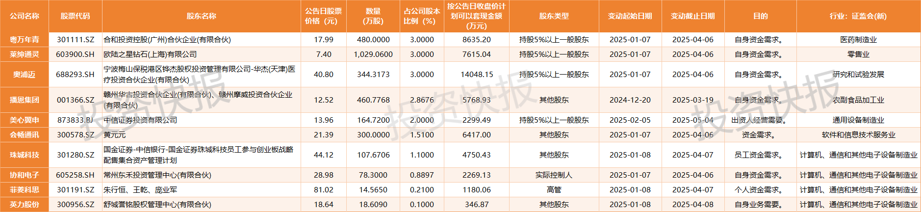 此外,播恩集团(001366.SZ)、美心翼申(873833.BJ)、会畅通讯(300578.SZ)、珠城科技(301280.SZ)和英力股份(300956.SZ)等多家上市公司也发布了股东减持股份的公告。这些减持计划涉及的股份数量从数十万股到数百万股不等,减持目的主要是自身资金需求及经营业务需要等。