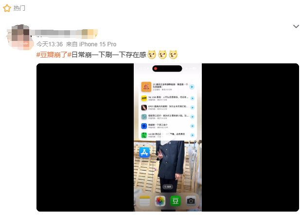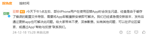 对此,今日15时28分,豆瓣在其最新微博评论区回应称,今天下午1点左右,部分iPhone用户在使用豆瓣App时会发生闪退,经查是由于缓存了错误的配置文件导致,需要将App卸载重新安装即可解决。