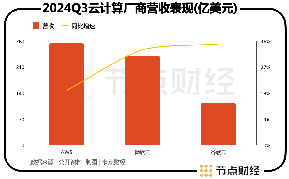 数据显示,2024年第三季度,AWS实现营收274.52亿美元,同比增长19%;同期,微软云和谷歌云营收分别为240.9亿美元、113.5亿美元,对应同比增速分别为33%、35%。