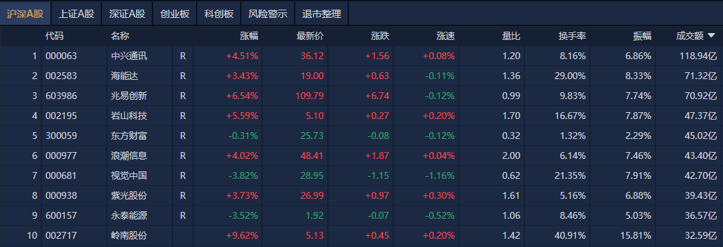 沪深两市半日成交额8582亿,较上个交易日放量257亿。个股方面,南财金融终端显示,中兴通讯成交额118.94亿元居首,海能达、兆易创新、岩山科技成交额靠前。