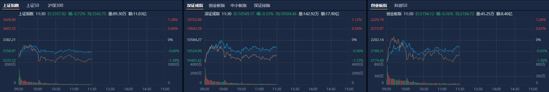 市场早盘低开后弱势震荡,三大指数小幅下跌。南财金融终端显示,截至早盘收盘,沪指跌0.72%,深成指跌0.33%,创业板指跌0.36%。盘面上市场热点较为杂乱轮动较快,个股普跌,全市场超4200只个股下跌。