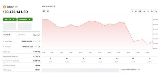 在美联储主席鲍威尔周三表示,联储不打算持有数字货币,并暗示将对明年降息采取更谨慎的态度后,比特币价格急挫,过去24小时下跌了近5%。本周早些时候,该加密货币一度创下108000美元以上的历史新高。