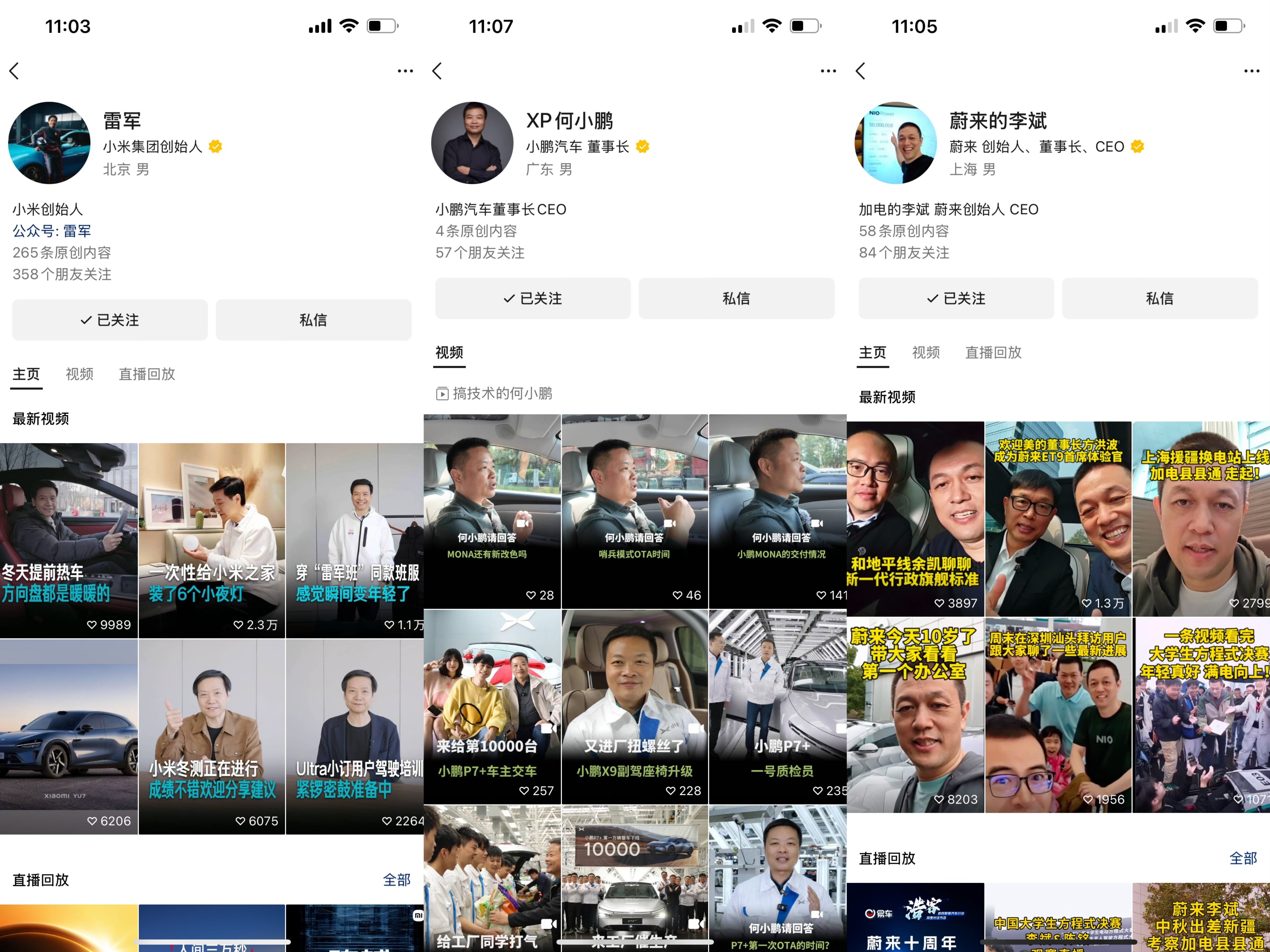 高管直播的影响力不仅在于信息传递,更在于其通过微信的关系链实现长尾传播。这种形式不仅强化了品牌领导者的个人影响力,还为品牌提供了持续的舆论热点。例如,蔚来汽车的李斌、小鹏汽车的何小鹏,以及小米汽车的雷军,已经成为其品牌的代表性符号,通过高频次的内容输出吸引了大量用户关注。