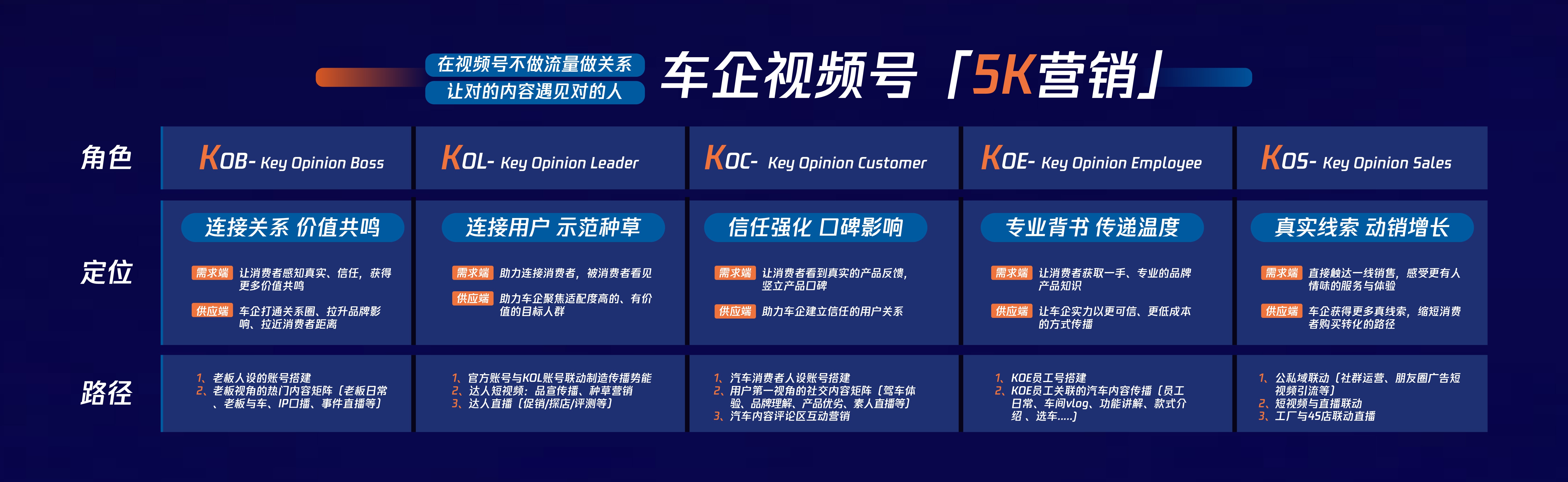 为了应对日益复杂的用户需求和市场竞争,车企都在积极探索数字化营销的新范式,其中视频号的5K营销模型可以说是一匹黑马——即Key Opinion Boss(KOB)、Key Opinion Leader(KOL)、Key Opinion Customer(KOC)、Key Opinion Employee(KOE)和Key Opinion Sales(KOS)。