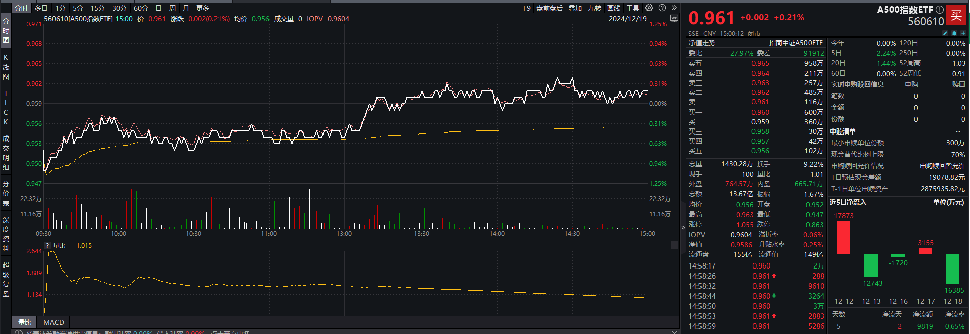 相关ETF方面,A500指数ETF(560610)昨日收盘上涨0.21%,成交额达13.67亿元,换手率超9%,溢折率0.06%。成分股方面,光环新网涨超11%,光迅科技、浪潮信息涨停,精测电子、兆易创新、华工科技、中兴通讯、深南电路等股跟涨。