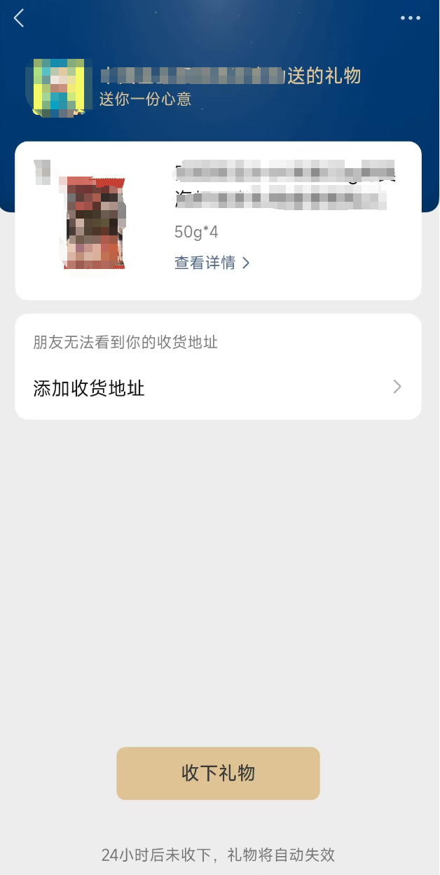 收到礼物后,会在聊天对话看到礼物信息,填写收货地址,就能正式收下礼物。