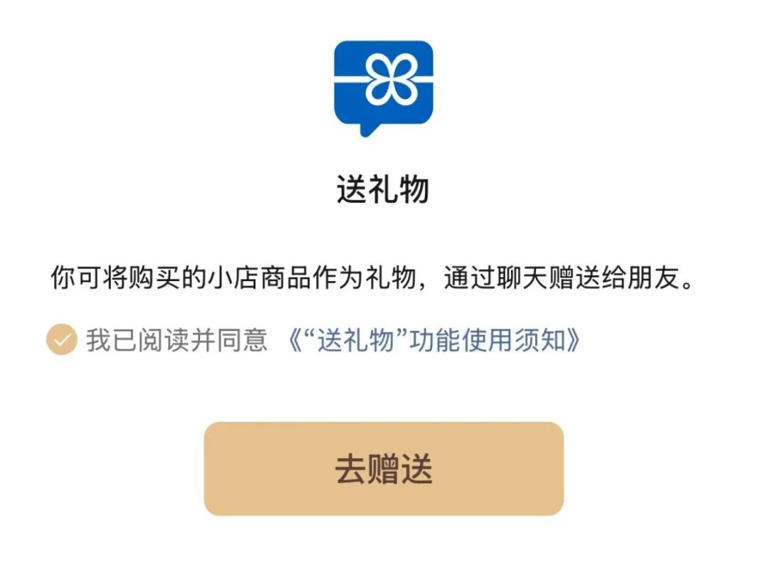 赠送方在符合规则的店铺中选购心仪的商品,并点击“送给朋友”选项,即可将商品以礼物的形式赠送给自己的微信好友。