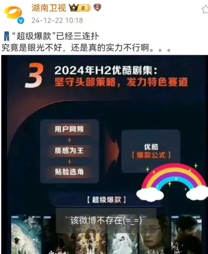 22日上午,网上流传的一张截图显示,ID名为湖南卫视的账号发文称:“超级爆款”已经三连扑,究竟是眼光不好,还是实力不行啊。随后#湖南卫视 优酷三连扑#话题登上热搜。