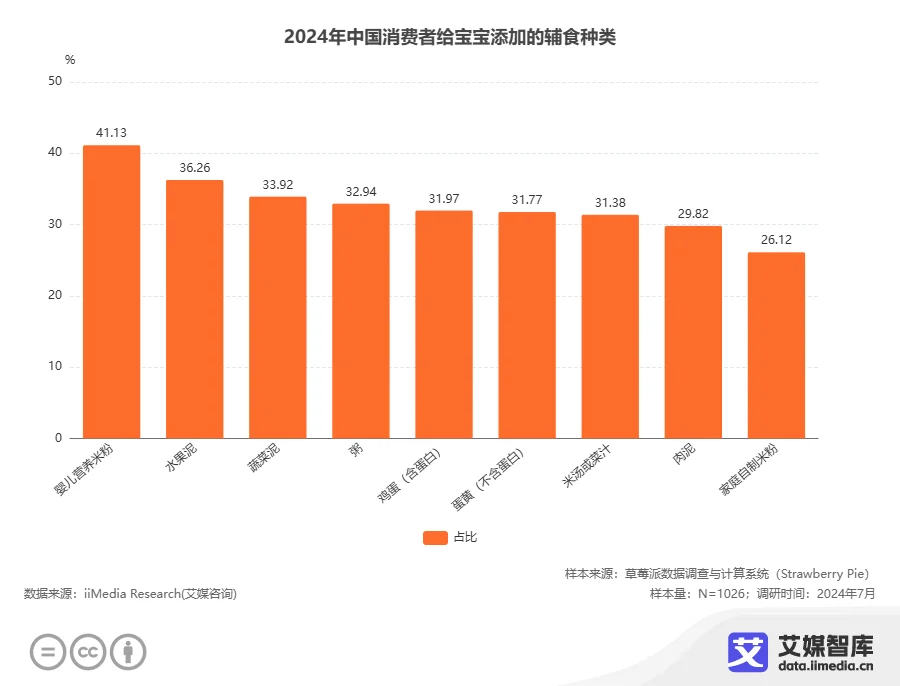 iiMedia Research(艾媒咨询)数据显示,消费者给宝宝添加的辅食种类多样,其中包括婴儿营养米粉(41.13%)、水果泥(36.26%)、蔬菜泥(33.92%)、粥(32.94%)、鸡蛋(31.97%)、蛋黄(31.77%)、米汤或菜汁(31.38%)、肉泥(29.82%)以及家庭自制米粉(26.12%)等。