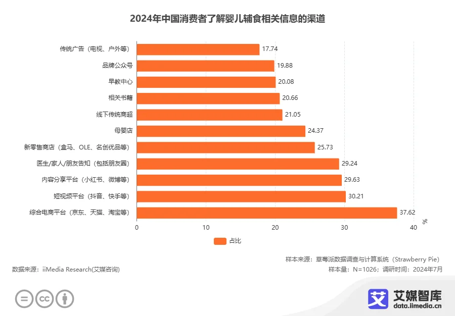 iiMedia Research(艾媒咨询)数据显示,在获取婴儿辅食相关信息方面,综合电商平台成为消费者的首选渠道,占比达37.62%。短视频平台和内容分享平台分别以30.21%和29.63%的占比位列第二、第三。此外,医生/家人/朋友告知(29.24%)、新零售商店(25.73%)以及母婴店(24.37%)等也是消费者了解婴儿辅食相关信息的重要渠道。