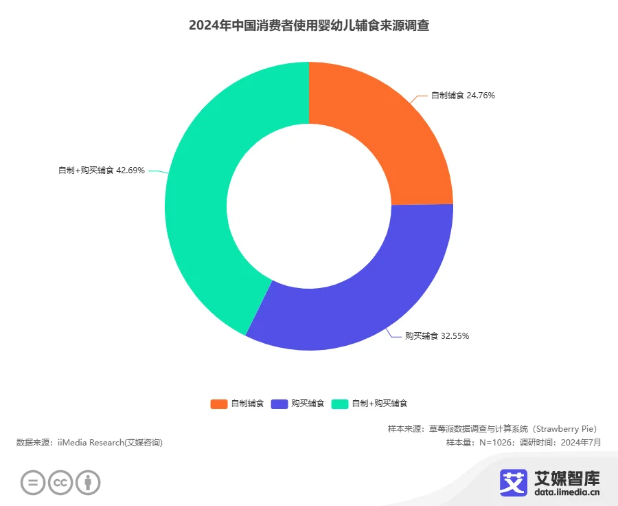 iiMedia Research(艾媒咨询)数据显示,关于婴幼儿辅食的来源,42.69%消费者表示既有自制也有购买,32.55%消费者完全依赖购买,而24.76%消费者则完全依靠自制。