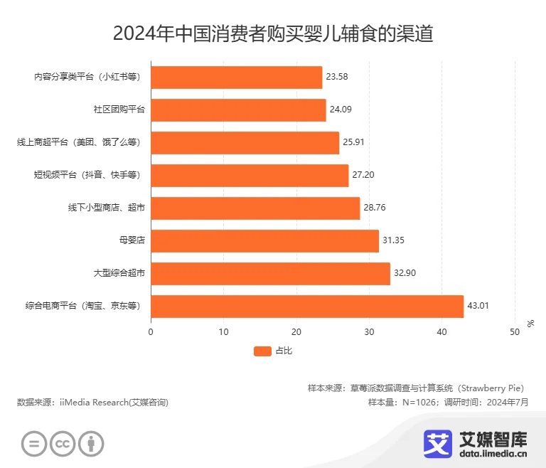 iiMedia Research(艾媒咨询)数据显示,43.01%消费者通过综合电商平台购买,占比最高。其次是大型综合超市和母婴店,其占比分别为32.90%和31.35%。相比之下,通过内容分享类平台购买的消费者占比较低,为23.58%。