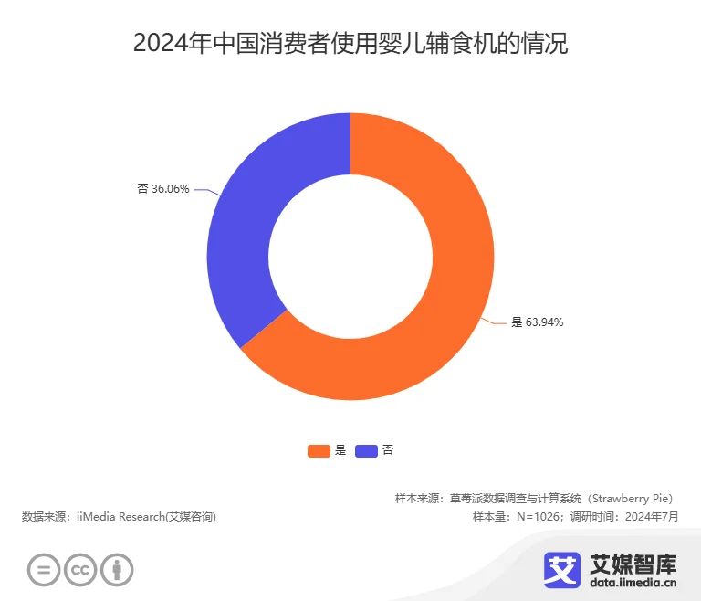 iiMedia Research(艾媒咨询)数据显示,63.94%消费者表示会使用婴儿辅食机,36.06%消费者表示不会使用婴儿辅食机。