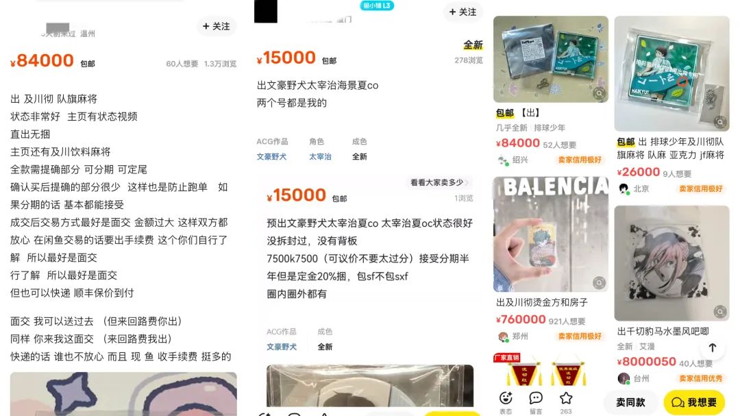 妮妮表示谷圈有一套圈内独特的定价体系,最基础的定价因素是谷子的发行数量,此外角色IP也会根据受欢迎程度被分为“冷、温、烫”的不同热度等级,IP热度越高其相关谷子的价格也越高,“烫门谷子比如五条悟、太宰治、及川彻、朔间零,不仅数量占据谷店的半壁江山,价格也是冷门谷子的几十倍,有些限量‘海景谷’甚至会被炒到5位数。在圈外人看来,就是花几万块,买了一块巴掌大小的动漫铁皮徽章。”