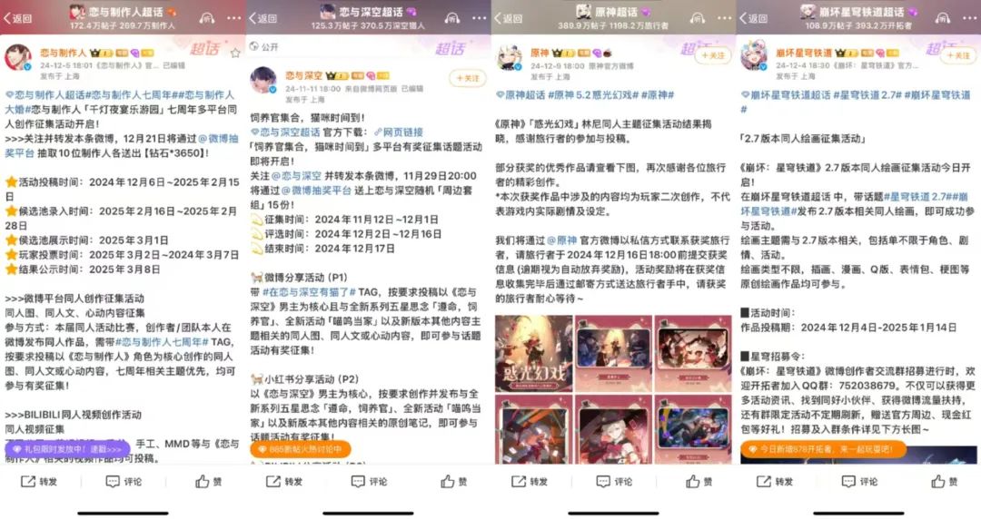 此外,惊蛰研究所了解到,如今粉丝群体性质的二创已经开始和官方产生联系,并催生了以“同人”为核心的商业模式。比如一些游戏官方会定期征集同人作品,通过微博、官网等平台展示玩家创作的同人作品,让同人作品在大量游戏玩家之间形成传播。
