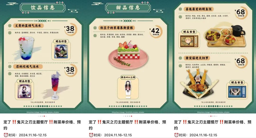 当消费者对IP的重视超过餐饮本身时,二次元主题餐厅的消费定价往往也处于较高区间。以近期次元波板糖的鬼灭之刃主题为例,全场最便宜的饮品标价38元,甜品酸奶碗标价42元,主食套餐普遍为68元,其定价标准明显高于常见的快餐连锁品牌。