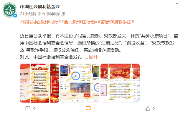 南财快讯·辟谣旋风队获悉,中国社会福利基金会12月23日发布声明称,近日接公众举报,有不法分子假冒民政部、财政部发文,杜撰“共赴小康项目”,盗用中国社会福利基金会信息,通过所谓的“注册抽奖”“创投收益”“财政专款发放”等欺诈手段,骗取公众信任,实施网络诈骗活动。