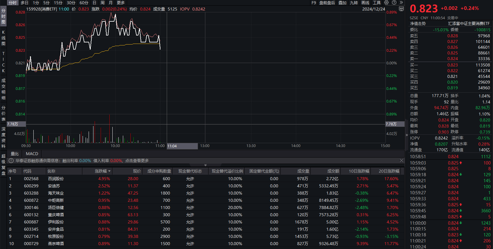 相关ETF方面,消费ETF(159928)截至发稿上涨0.24%,盘中换手率1.04%,成交额1.46亿元。成分股方面,百润股份涨4.95%,安迪苏涨2.52%,海天味业、中炬高新、汤臣倍健等多股跟涨。