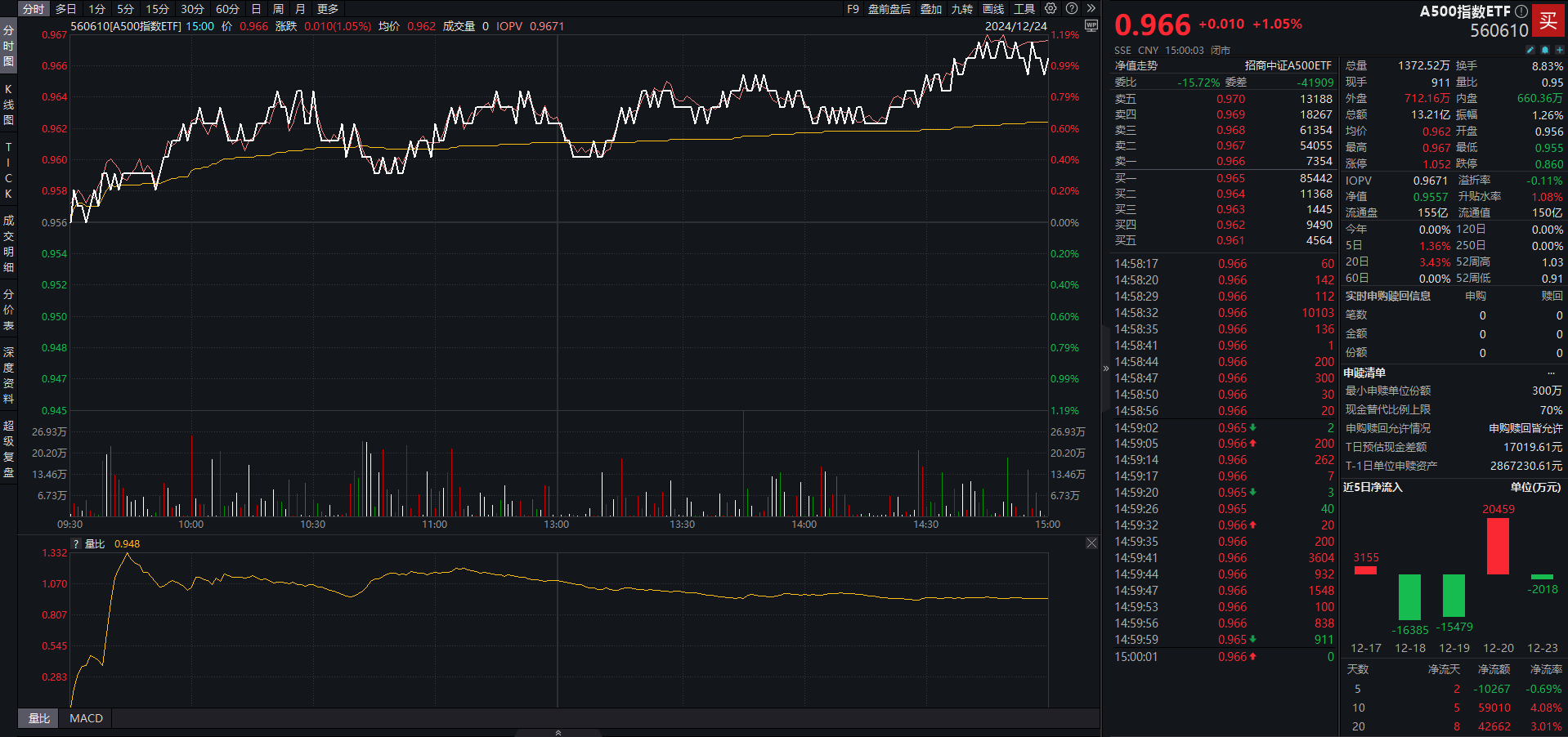 A500指数ETF(560610)昨日涨1.05%,交投活跃。具体来看,换手率8.83%,全天成交额超13亿元,为连续43个交易日成交额超10亿元。成分股方面,四川长虹、新产业涨超8%,欧普康视、浪潮信息、三环集团等多股涨超5%。