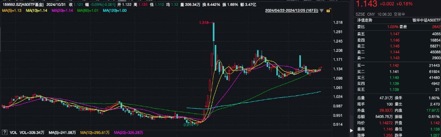 相关ETF方面,A50ETF基金(159592)早盘拉升,截至发稿涨0.18%,成交额超5400万元,换手率1.60%,早盘交投活跃。Wind金融终端数据显示,截至12月24日,A50ETF基金(159592)最新流通规模33.65亿元,最新流通份额29.48亿份。