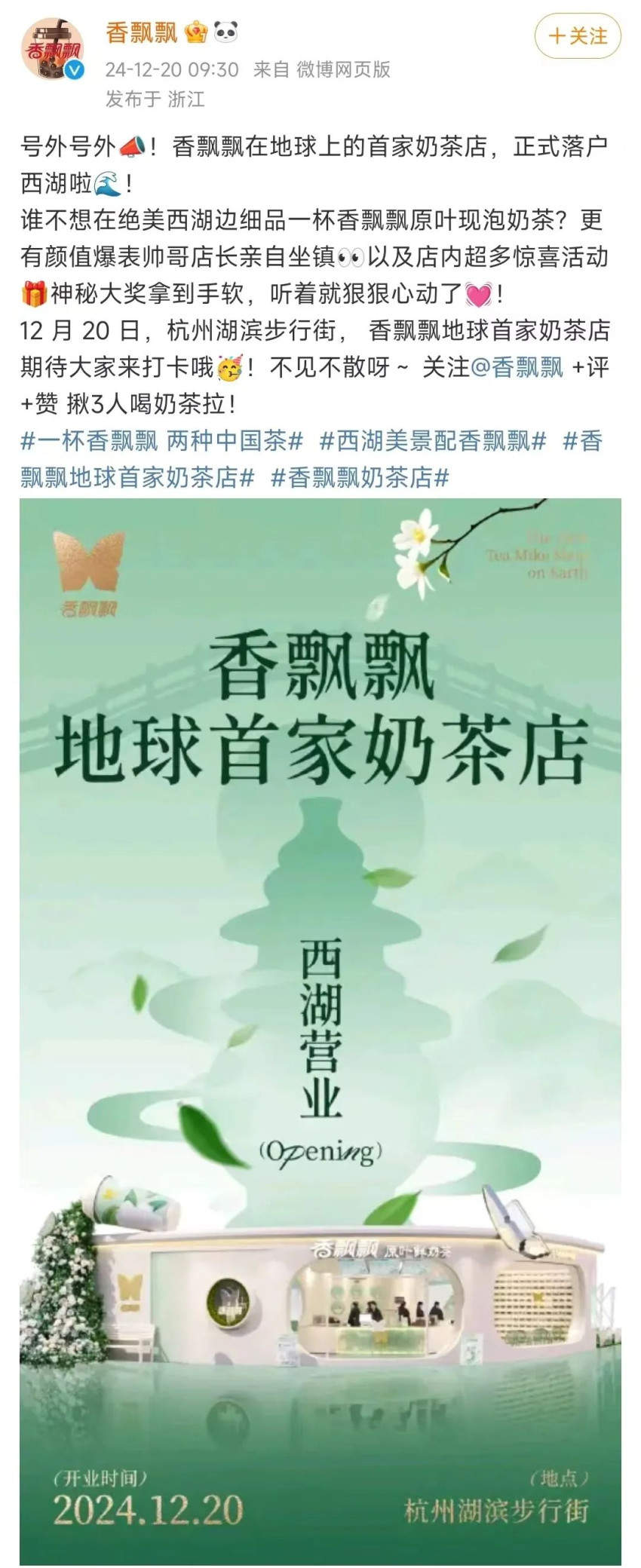 而随着香飘飘官微发布推文:“香飘飘在地球上的首家奶茶店,正式落户西湖。”网友的疑惑被打消,香飘飘首家奶茶店正式落子杭州。