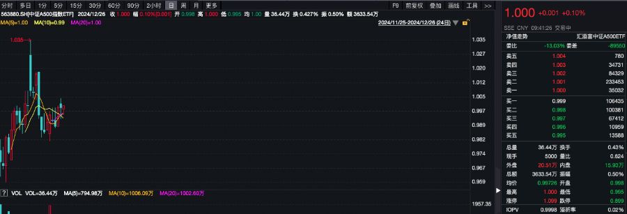 相关ETF中,中证A500指数ETF(563880)早盘翻红,截至发稿涨0.10%,成交额超3600万元,溢折率0.02%,盘初频现溢价交易。