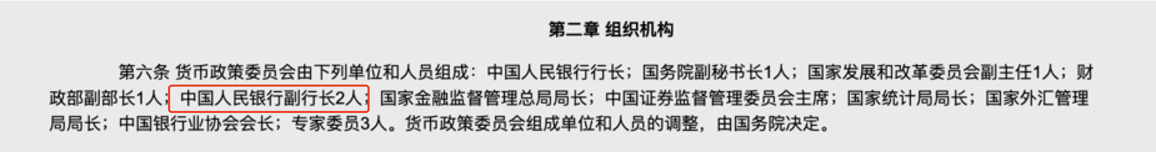 根据中国人民银行货币政策委员会条例,货币政策委员会人员还应包括2名中国人民银行副行长。不过,记者注意到,本次更新的名单中只有一位中国人民银行副行长宣昌能,中国人民银行原副行长张青松的退出使得货币政策委员会的人员名单由14人减少至13人,这也意味着后续还会有一位中国人民银行副行长进行补位。
