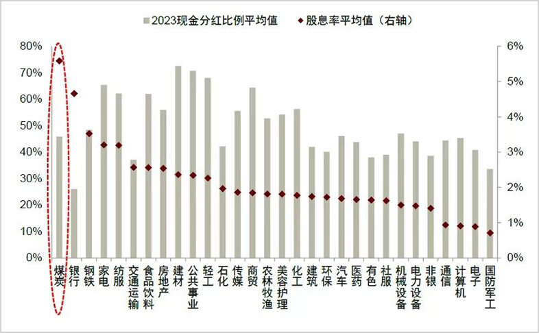 根据方正证券的统计数据,近12个月煤炭板块的股息率高达6.5%,全行业第一,而在2023年,A股平均股息率大约只有3%。