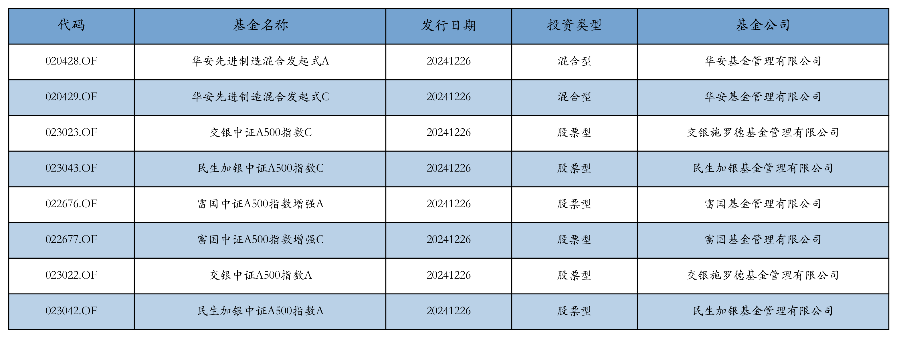 昨日有8只新基金发行,分别为:华安先进制造混合发起式A、华安先进制造混合发起式C、交银中证A500指数C、民生加银中证A500指数C、富国中证A500指数增强A、富国中证A500指数增强C、交银中证A500指数A、民生加银中证A500指数A,详情见下表: