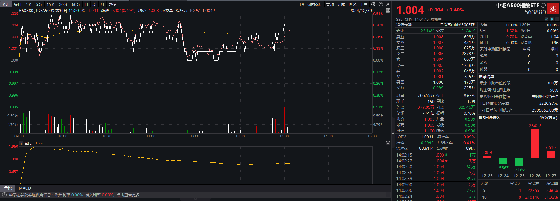 资金流向上,Wind数据显示,中证A500指数ETF(563880)上周五个交易日累计 “吸金” 超2.2亿元。截至12月27日收盘,中证A500指数ETF(563880)最新流通规模88.60亿元,最新流通份额88.61亿份,均创历史新高。