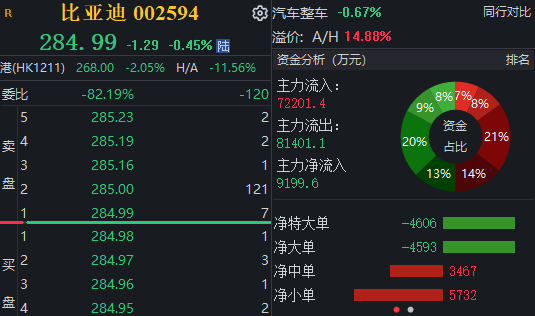 截至今日收盘,比亚迪报每股284.99元,下跌0.45%,总市值为8291亿元。