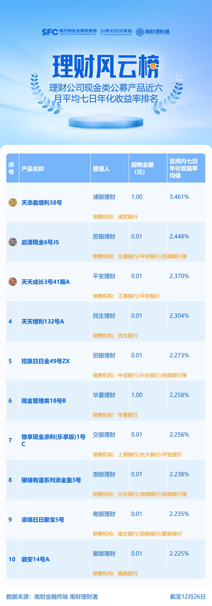 榜单第四名民生理财“天天增利132号A”成立于2024年6月26日,为一级(低风险)现金理财,12月29日七日年化收益率为1.45%。该产品三季度末超七成资金投向银行存款等现金类资产,前十大持仓也主要为银行存款、同业存单。