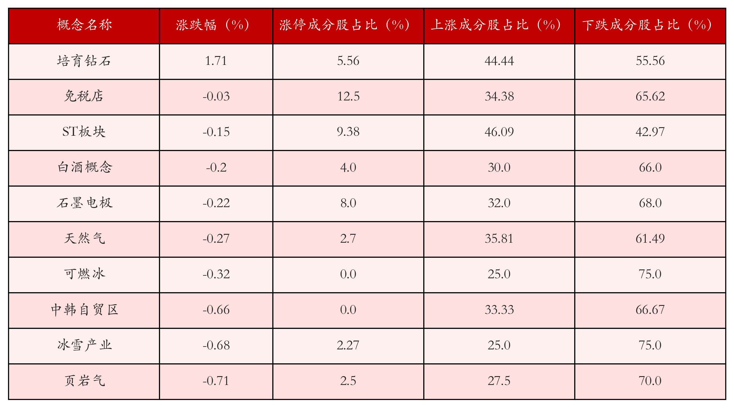 根据A股概念涨跌幅与所对应的股票池综合分析,涨幅靠前的三个概念板块分别为:培育钻石、免税店与ST板块。排名前10位的概念板块相关数据见下表: