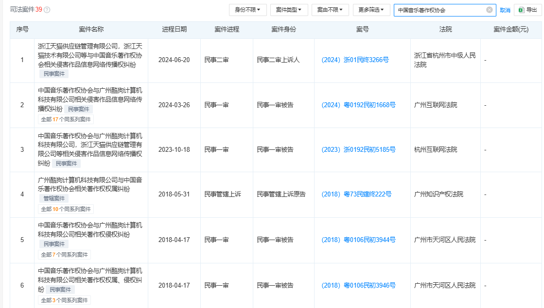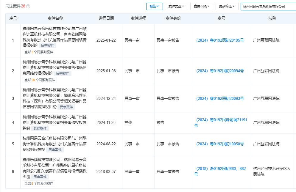 南财快讯记者注意到,酷狗音乐除了被音著协提起诉讼外,同行业公司也向其提起诉讼。天眼查显示,网易云音乐多次向酷狗音乐提起诉讼,涉及事项包括著作权权属纠纷、侵害作品信息网络传播权纠纷等。