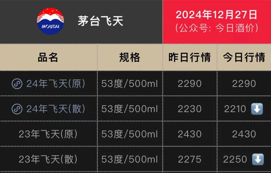 至12月27日,“今日酒价”平台显示,24年飞天茅台原箱价格为2290,散瓶则只有2210元,年内降幅约2成。