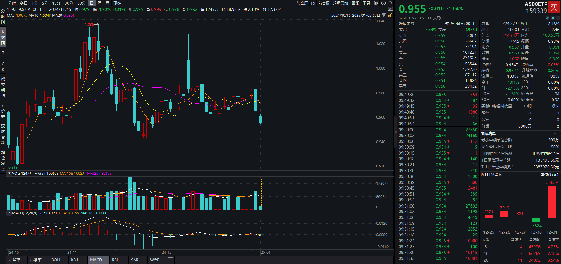 资金流向方面,A500ETF(159339)上一交易日(2024年12月31日)获资金大幅流入,单日净流入超3.8亿元。Wind金融终端数据显示,截至2024年12月31日,该ETF最新流通规模为98.82亿元,最新流通份额为102.65亿份,均创下历史新高。