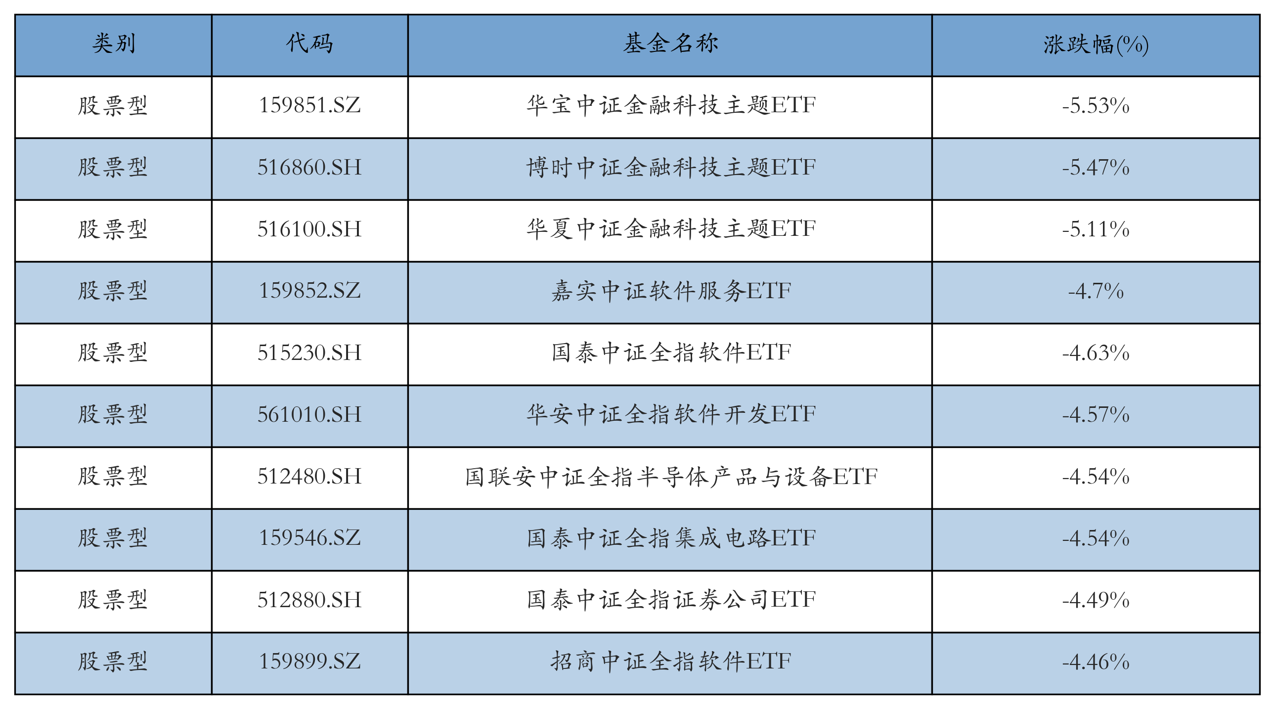 上一交易日股票型ETF跌幅最大的3支ETF及其收益率分别为:华宝中证金融科技主题ETF(-5.53%)、博时中证金融科技主题ETF(-5.47%)、华夏中证金融科技主题ETF(-5.11%)。跌幅前10详情见下表: